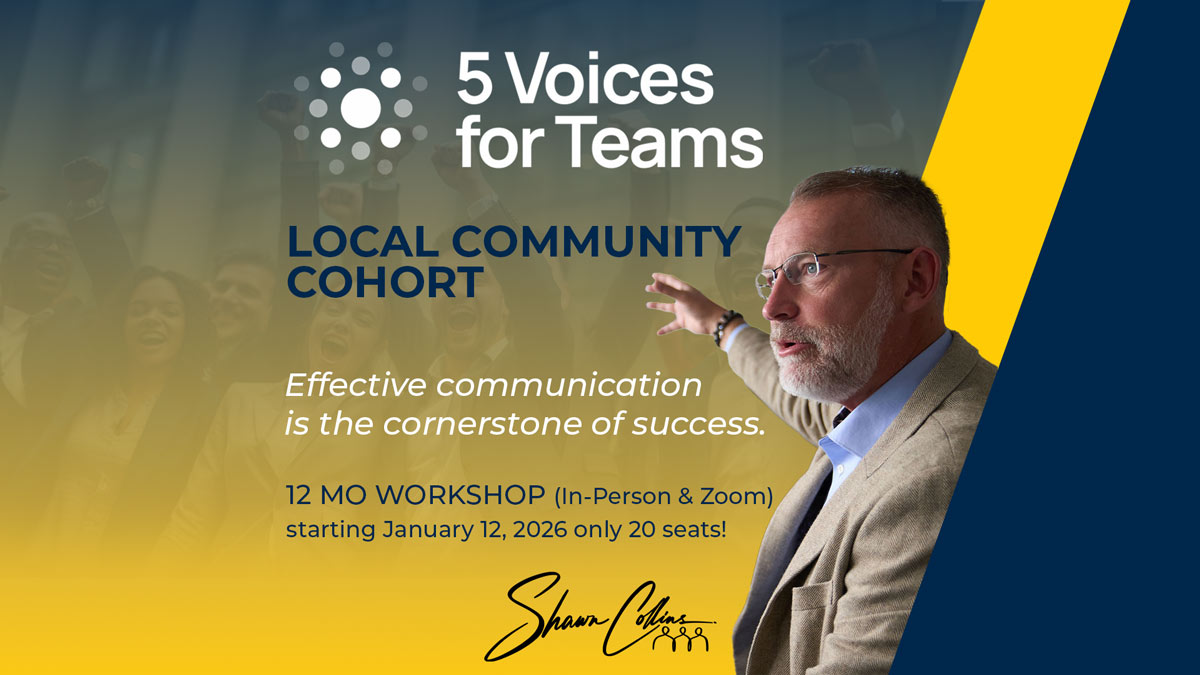 EXTEND GROUP - THRIVE Hall 530 Main Street, Evansville, IN, United StatesUnlock Your Leadership Voice with Shawn Collins – Free 5 Voices Bootcamp Join leadership coach Shawn Collins for an exclusive one-hour session to discover your leadership voice, unlock your influence, and learn how to elevate your team. Hosted at EXTEND GROUP’s THRIVE Hall. Event Details: Location Partner: EXTEND GROUP – THRIVE Hall (Evansville, IN)Date: October 25, 2025; 11:00 AM - 1:00 PMSeats: Limited to 20 leadersCost: Free What You’ll Experience: Learn the 5 Voices leadership framework from Shawn Collins. Identify your natural leadership voice order. Discover your inherent leadership superpower and blind spots. Walk away with 1 actionable tool to grow your influence in 30 days. Receive access to the free 5 Voices online assessment. Why Attend: Gain immediate clarity in just 60 minutes. Network with other growth-minded leaders. Hosted by Shawn Collins, Leadership Coach, Speaker, Certified GiANT Worldwide Consultant. Preview a 12-Month 5 Voices for Teams Cohort launching January 2026. Register below to reserve your seat — only 20 available.